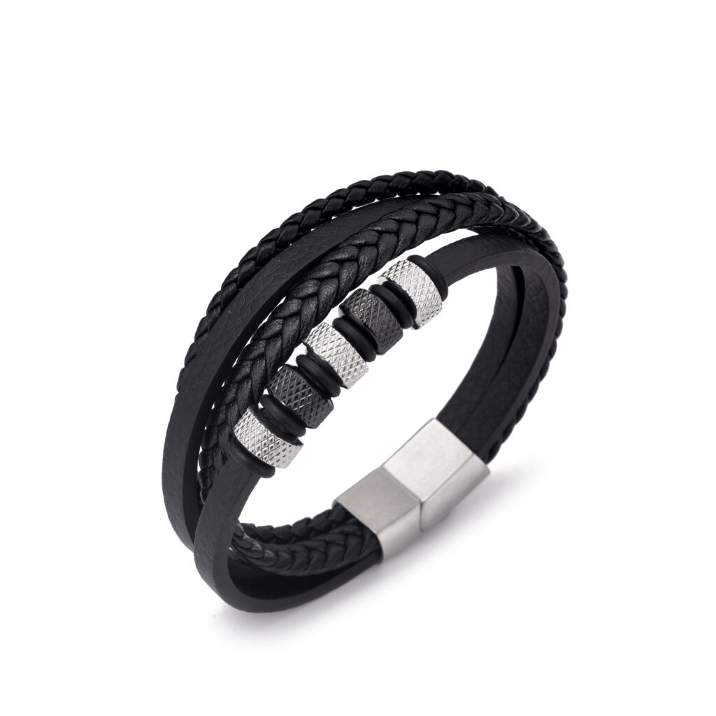 Bratara barbati din piele naturala negru-argintiu Cercuri