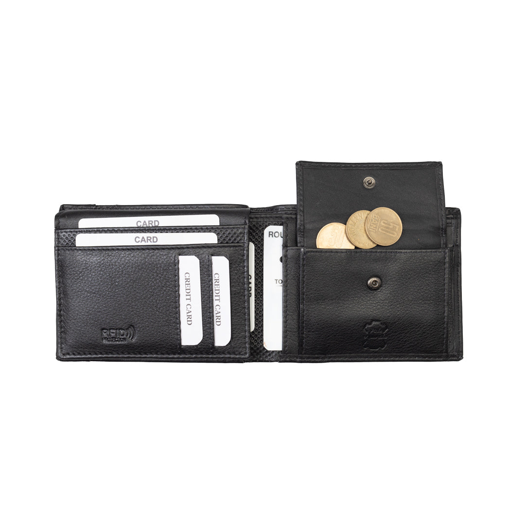 Portofelul pentru bărbați Vox, este un accesoriu rafinat și practic, ideal pentru păstrarea banilor, cardurilor și documentelor într-un mod organizat și sigur. Acesta este confecționat din piele naturală de culoare neagră, sugerând un aspect elegant și clasic, potrivit pentru diverse ocazii. Confecționat din piele naturală autentică, portofelul "Vox" nu doar că are un aspect distinct, ci și promite să fie durabil și rezistent în timp.