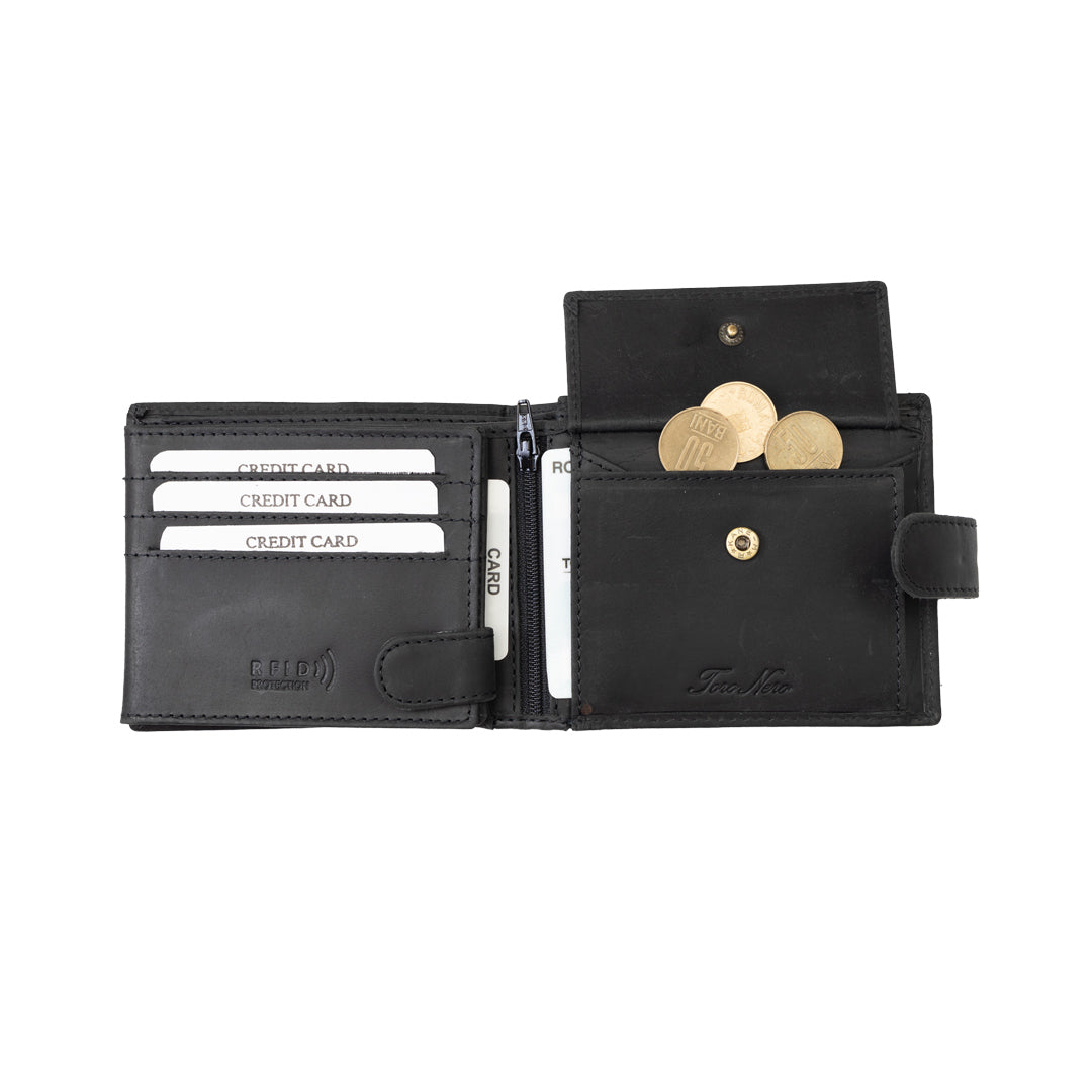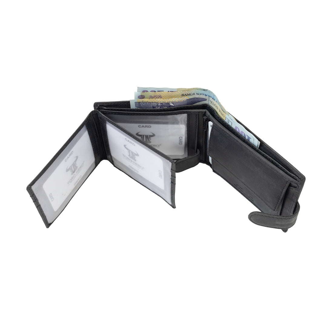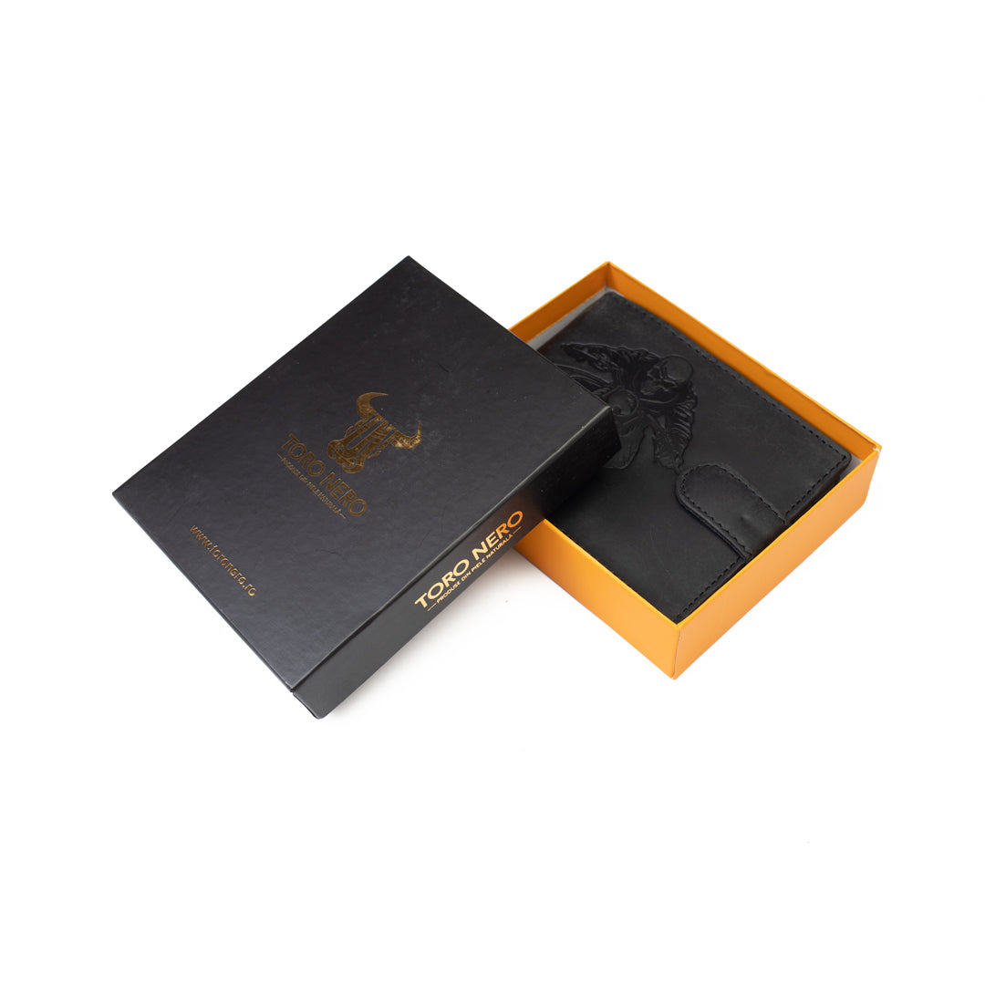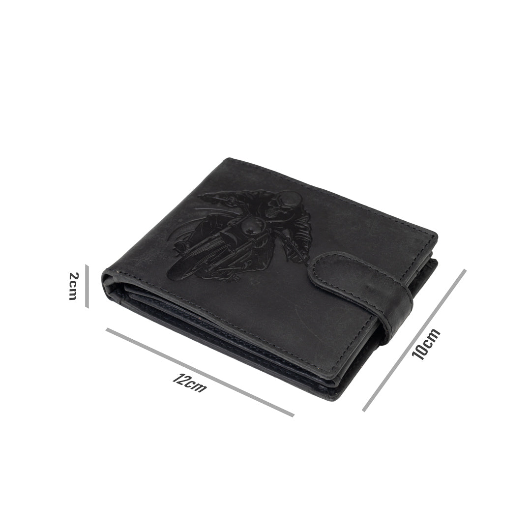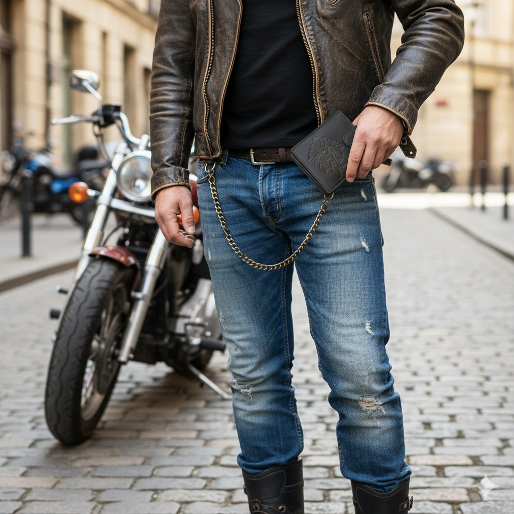 Portofelul pentru bărbați din piele naturală negru, decorat cu motocicletă stilizată,emană o estetică robustă și aventuroasă. Realizat manual din piele de vacă de calitate, oferă o patină autentică și rezistență în timp.Designul practic include un lanț detașabil, ideal pentru siguranță pe motocicletă, și un interior generos: 9 sloturi pentru carduri, buzunare pentru bancnote, plus compartiment cu fermoar și clapetă pentru moned. Protecția RFID păstrează datele în siguranță, iar gravura motocicletei transmite stil și personalitate. Perfect pentru pasionații de moto, dar și pentru bărbatul modern care caută funcționalitate și design autentic.