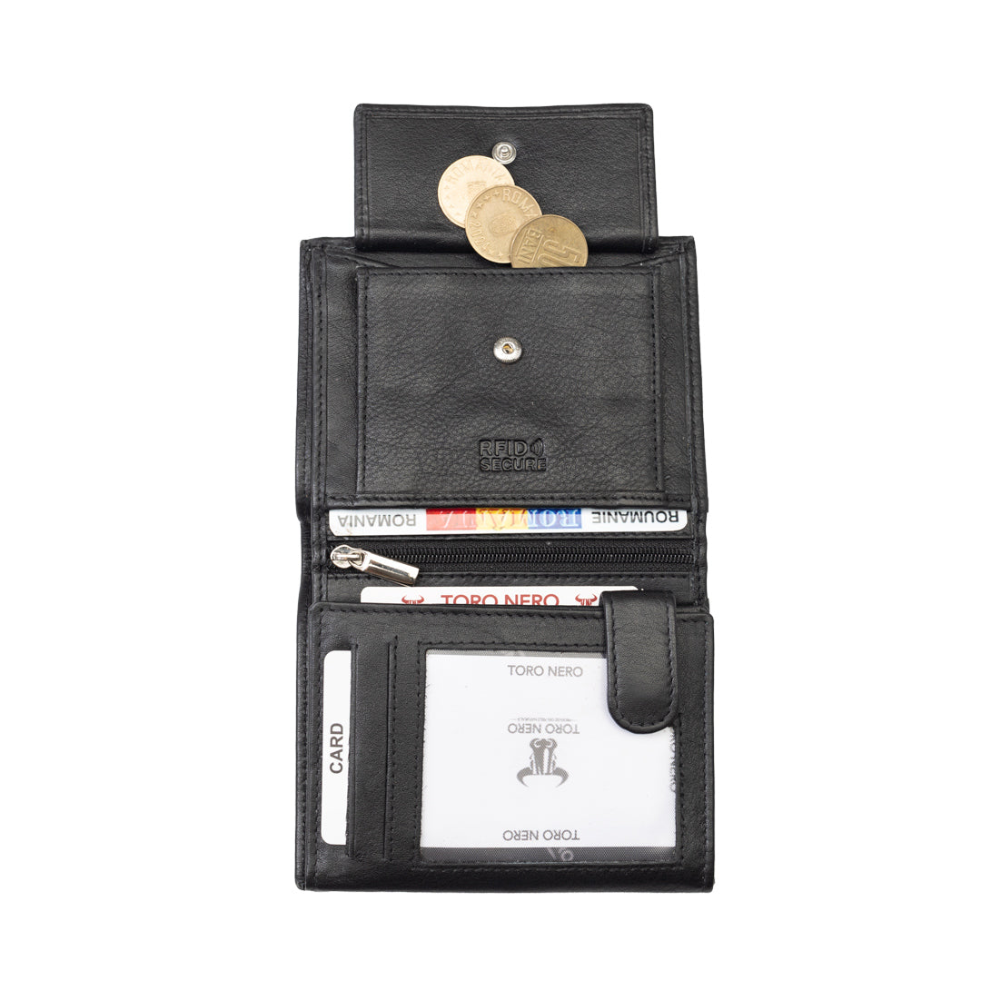 Portofelul pentru bărbați Ryan, este un accesoriu rafinat și practic, ideal pentru păstrarea banilor, cardurilor și documentelor într-un mod organizat și sigur. Acesta este confecționat din piele naturală de culoare neagră, sugerând un aspect elegant și clasic, potrivit pentru diverse ocazii. Confecționat din piele naturală autentică, portofelul „Ryan” nu doar că are un aspect distins, ci și promite să fie durabil și rezistent în timp.