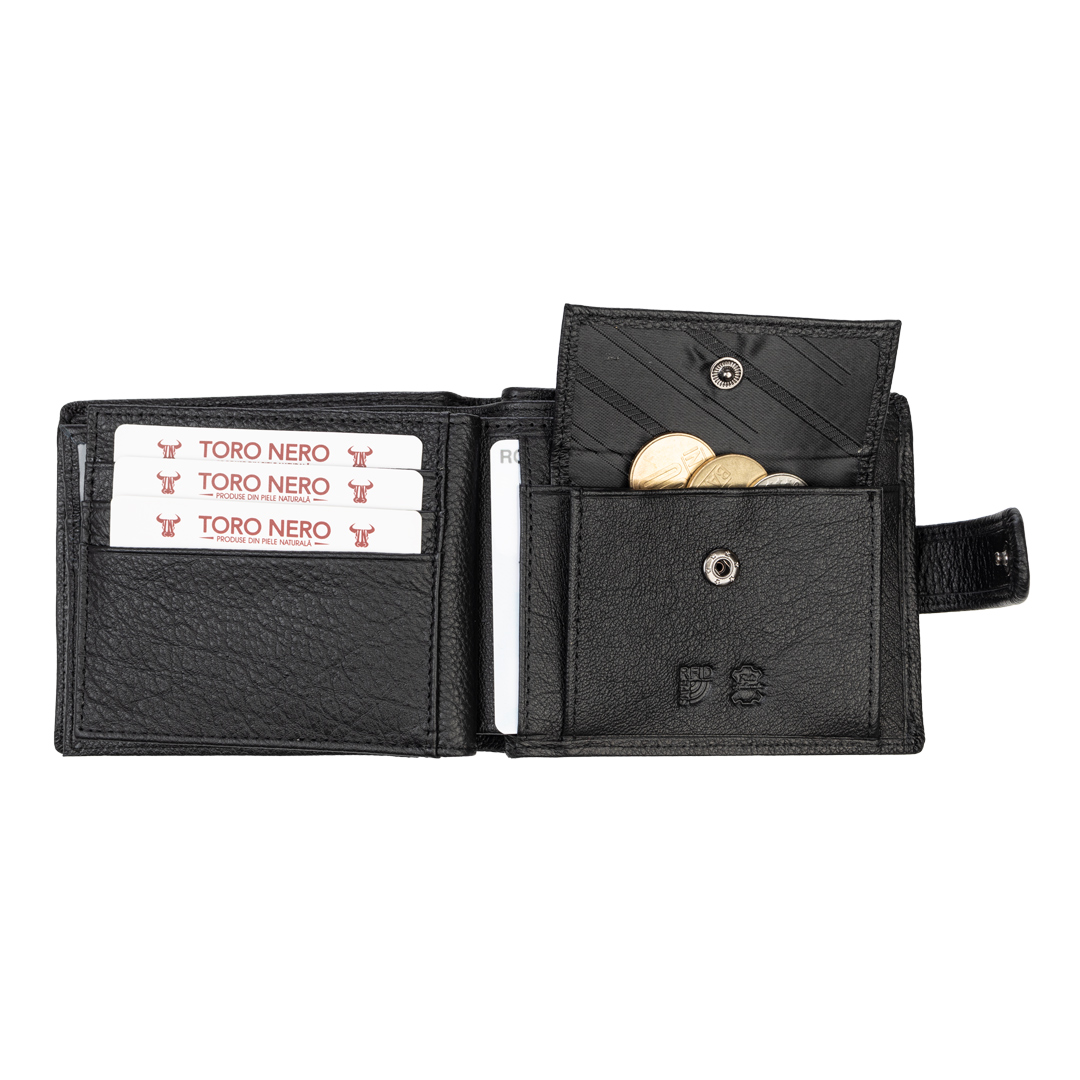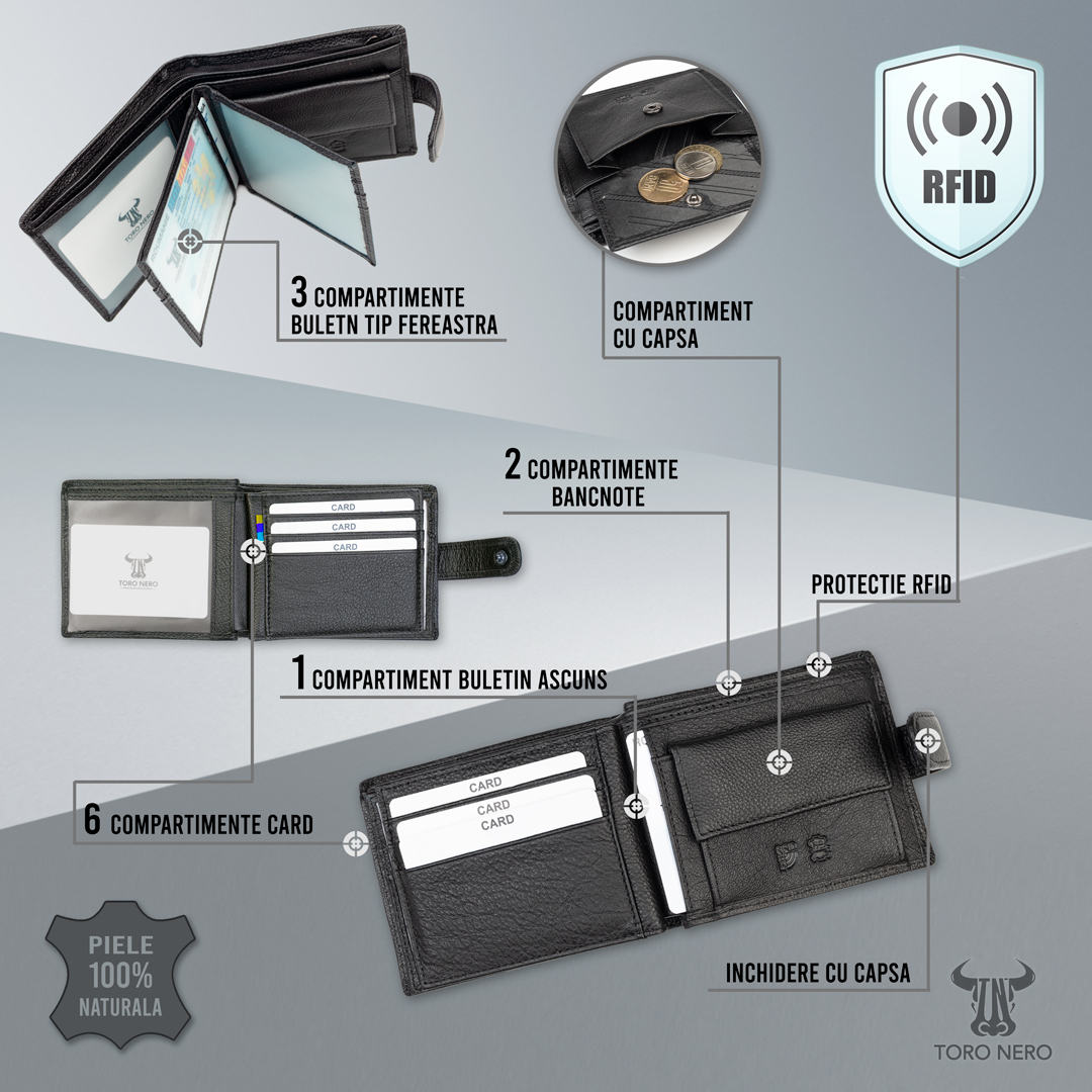 Portofelul „Executive Black” este un portofel care sugerează un design elegant și potrivit pentru persoanele care caută un aspect profesionist și rafinat. „Executive Black” are un design sofisticat și profesional, potrivit pentru medii de afaceri și evenimente formale. Culoarea predominantă negru sugereaza o imagine serioasă și elegantă.Portofelul are dimensiuni potrivite pentru a se potrivi în buzunarul unei perechi de pantaloni sau într-o geantă.Portofelul ofera compartimente bine definite pentru carduri de credit, carduri de debit, bani și alte documente. Acest fapt se datorează celor 14 compartimente generoase ale modelului Executive Black. Astfel, vei putea să păstrezi în portofel lucrurile care contează pentru tine și stilul tău de viață, precum: monede, bancnote, buletin, carduri bancare sau de fidelitate, permis de conducere.Portofelul este fabricat din materiale de calitate superioară, cum ar fi piele autentică durabila.