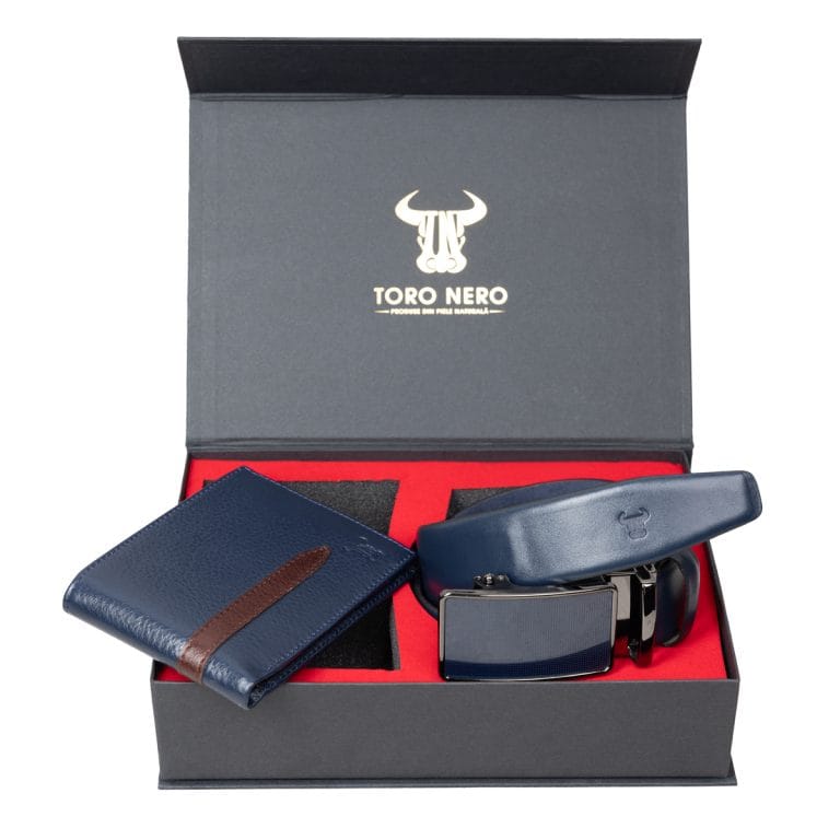 Setul cadou pentru barbati oferit de Toronero este o alegere perfectă pentru cei care apreciază accesorii de calitate din piele naturală. Setul este disponibil într-o nuanță clasică de bleumarin și include un portofel și o curea, ambele realizate din piele naturală premium. Portofelul este conceput pentru a oferi spațiu suficient pentru carduri, bancnote și alte documente importante, având multiple compartimente și sloturi organizate strategic. Construcția solidă și detaliile rafinate fac din acest portofel nu doar un accesoriu util, ci și un element de stil. Cureaua este fabricată cu aceeași atenție la detalii și calitate, fiind rezistentă și confortabilă de purtat. Cataramele de calitate asigură fixarea solidă și ajustabilă a curelei pentru a se potrivi oricărei talii. Acest set cadou este perfect pentru barbati care apreciază eleganța și rafinamentul, oferindu-le accesorii practice și durabile, care să completeze cu stil ținutele lor. Fiind fabricate din piele naturală de cea mai înaltă calitate, aceste accesorii vor fi apreciate de orice destinatar.